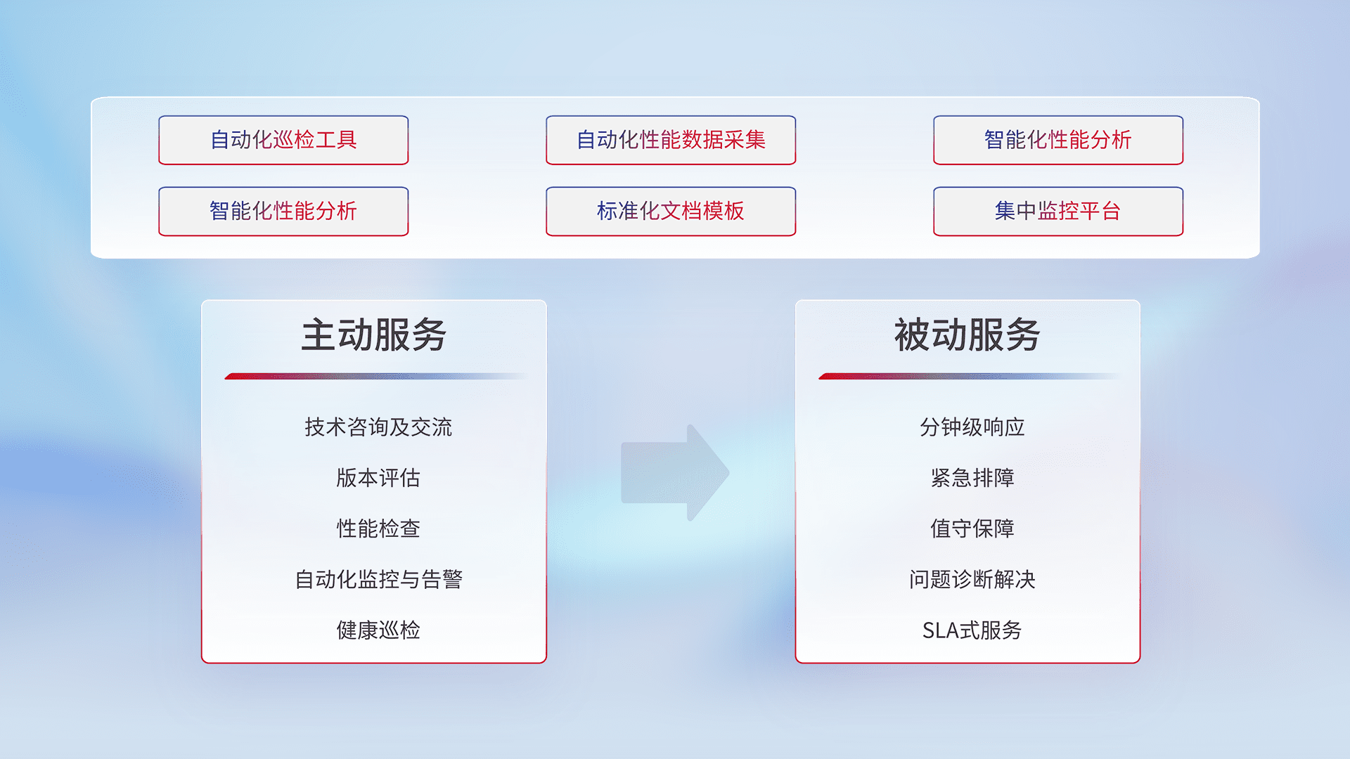 智能化工具和标准化文档,,保障服务质量,,提供主动服务(包含技术咨询、、版本评估、、性能检查、、、自动化监控与告警、、健康巡检)和被动服务包含(分钟级响应、、紧急排障、、值守保障、、、问题诊断解决、、、SLA服务)。。