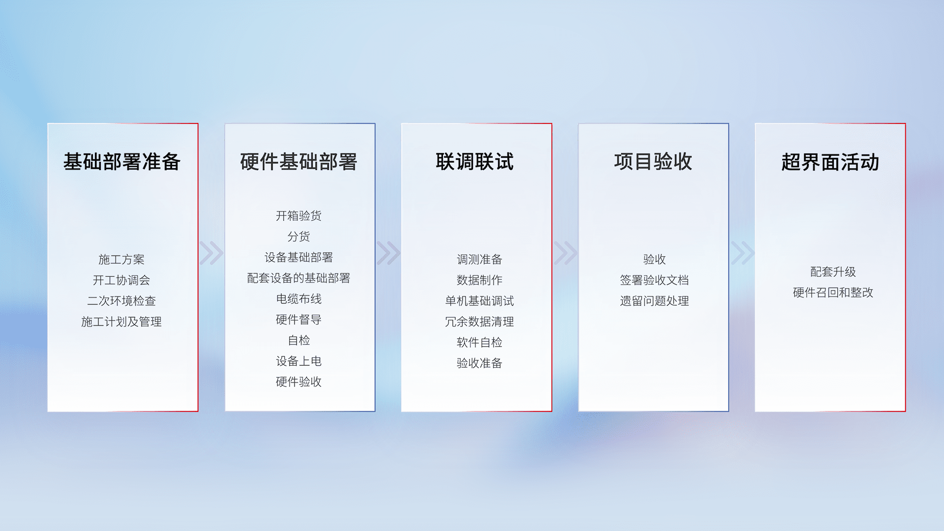 从基础部署准备、、、硬件基础部署、、、、联调联试、、、项目验收、、、越界面活动的全过程可追溯,,,,保证施工质量和进度。。。